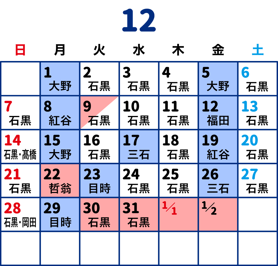保険診療全科目臨時休診12/1、12/5、12/8、12/12、12/15、12/17、12/19、12/23、12/26、12/29